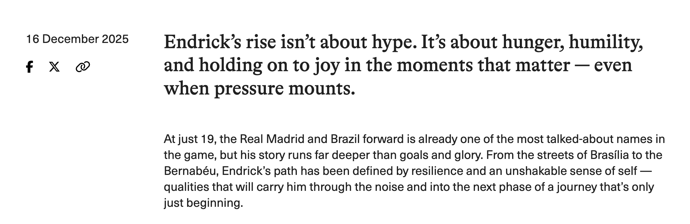 Through long-form editorial writing and cinematic video vignettes, we created a body of work that positioned Endrick as part of a new generation of athletes navigating pressure, purpose, and visibility on their own terms.